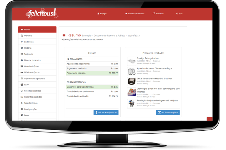 Você escolhe os produtos, como em qualquer loja. Seus convidados comprarão com cartão, parcelado se preferir, ou boleto. Eles recebem a confirmação por email e você acompanha tudo pelo seu painel.