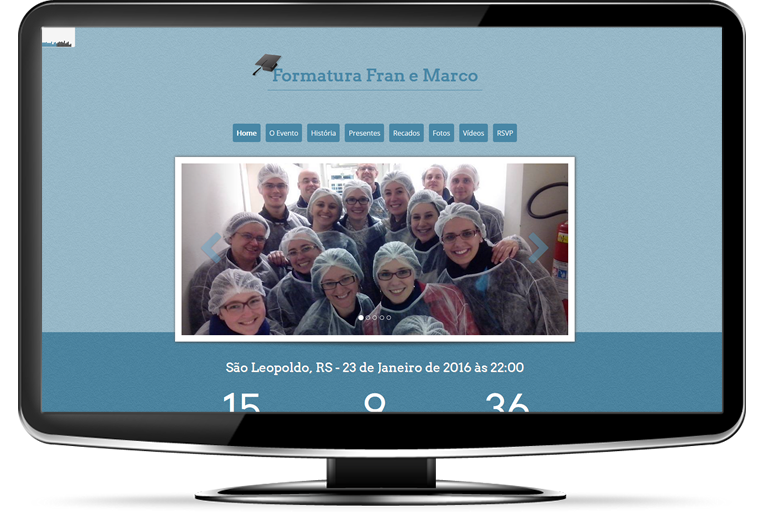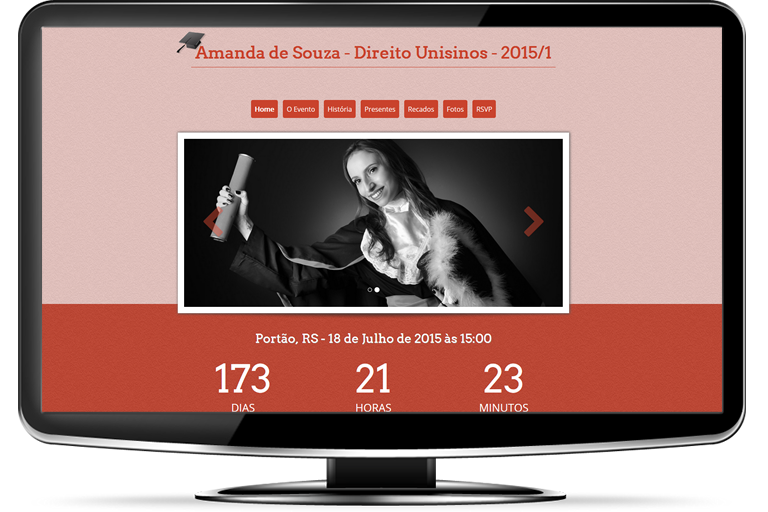 Preparamos para você um site diferenciado e personalizado para que você divulgue todas as informações sobre a sua formatura. Você poderá criar sua lista de presentes virtuais, as confirmações de presença para os convidados e várias outras informações sobre você e seus pais.